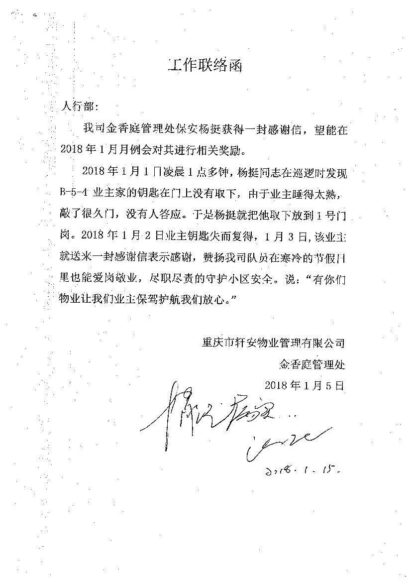 來自軒安物業(yè)的保安員楊挺認真盡責的工作態(tài)度與全心全意為業(yè)主著想的品質深深感動了業(yè)主,他們在第一時間送來感謝信,贊揚中威戰(zhàn)士楊挺盡職盡職。