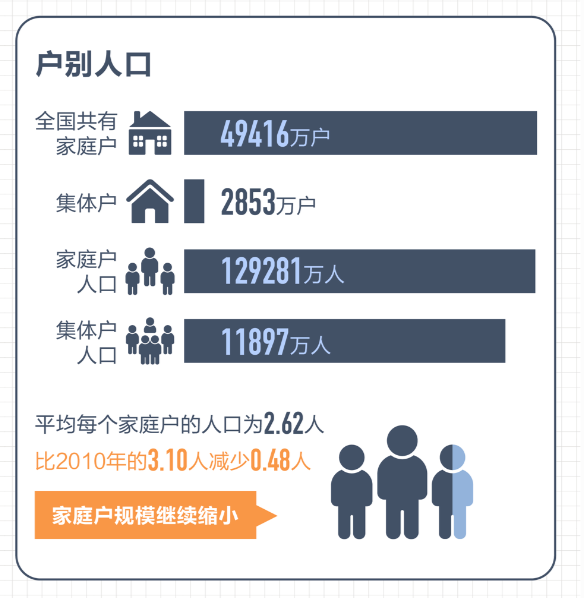 普查結(jié)果顯示,全國共有家庭戶49416萬戶,家庭戶人口為129281萬人。平均每個(gè)家庭戶人口為2.62人,比2010年減少0.48人。